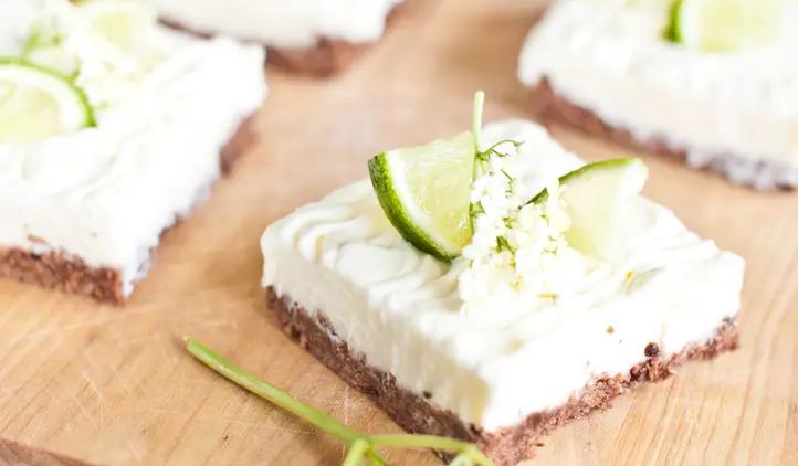 Hotový cheesecake krájejte na řezy a každý ozdobte tenkým plátkem limetky a bezovými květy.