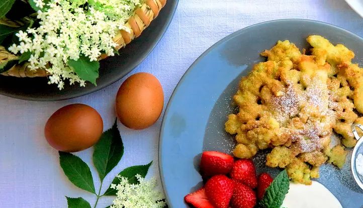 10 květů černého bezu, vejce, 100 ml mléka, lžíce rumu, lžička másla, 3 lžíce hladké mouky, špetka soli, 250 ml oleje, lžíce cukru moučka.