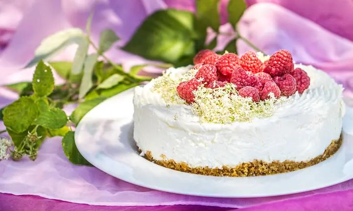 Tu nalij na připravenou sušenkovou krustu, vlož do lednice a nech tři hodiny ztuhnout. Navrch ozdob čerstvými malinami a bezovými kvítky.