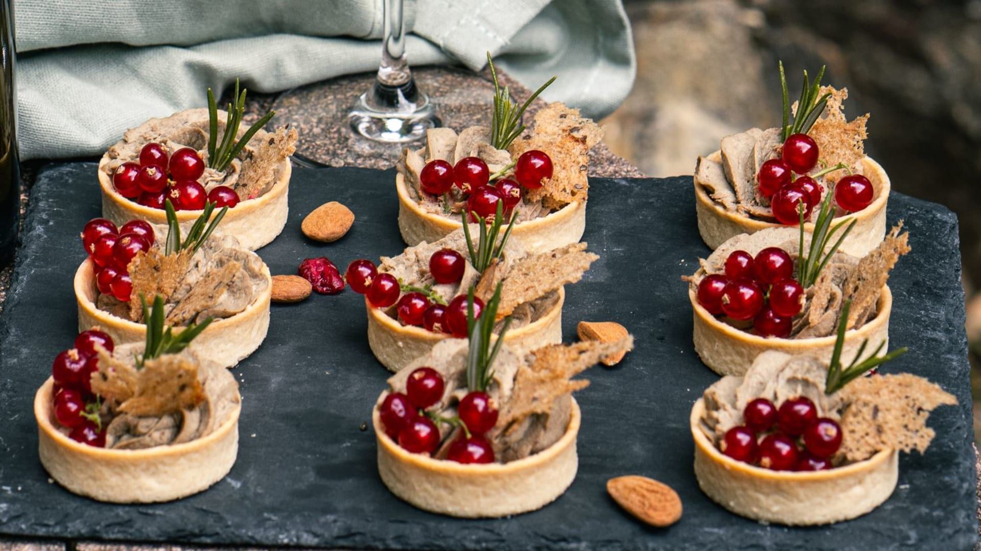 Tousty vykroj pomocí skleničky, potři paštikou a dozdob brusinkami, rozmarýnem, mandlemi.
