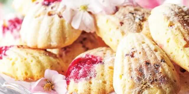 Troubu předehřej na 190°C, horní a spodní ohřev. Formičky na madlenky vymaž 5 g změklého másla a do každé formičky vlož malinu a třešňový květ.