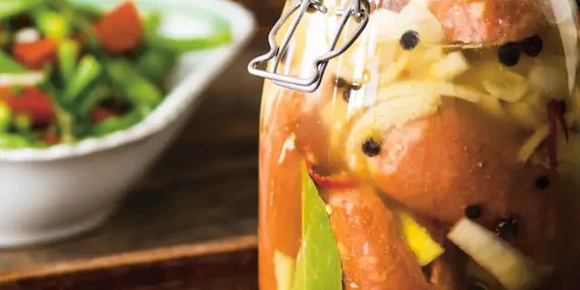 Lák: 240 ml piva, 8 lžic cukru, lžíce soli, 80 ml octa, 4 bobkové listy, 8 kuliček nového koření, 16 kuliček pepře, 8 špekáčků, 4 lžíce plnotučné hořčice, 1/2 lžičky mletého pepře, 4 velké cibule, 8 malých chilli papriček.