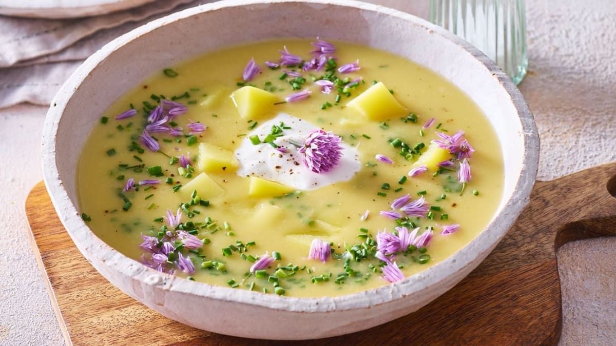 pažitka hrst, zakysaná smetana (k podávání), pažitkové květy (k podávání).