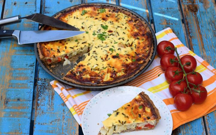 Přidej nakrájenou pažitku, promíchej a nalij na zeleninu a sýr. Takto připravené vlož do trouby vyhřáté na 200˚C a peč cca 45-50 minut.
