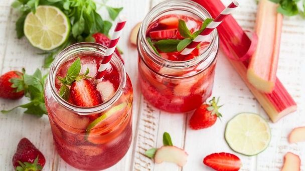 jahody, máta, plátky limetky, špalíčky rebarbory.