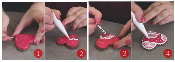 Srdíčka potáhni a na zaschlou plochu párátkem naznač obrysy, obtáhni je bílkovou polevou. Nevadí, když přetá- hneš, pod polevou se to schová.