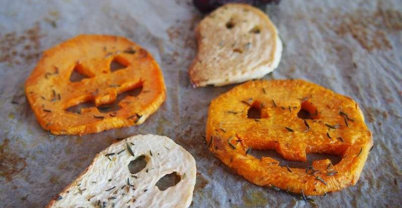 Zeleninu zbav slupky a nakrájej na tenčí kolečka. U batátu pomocí nože naznač obličeje a vyřízni viz foto.